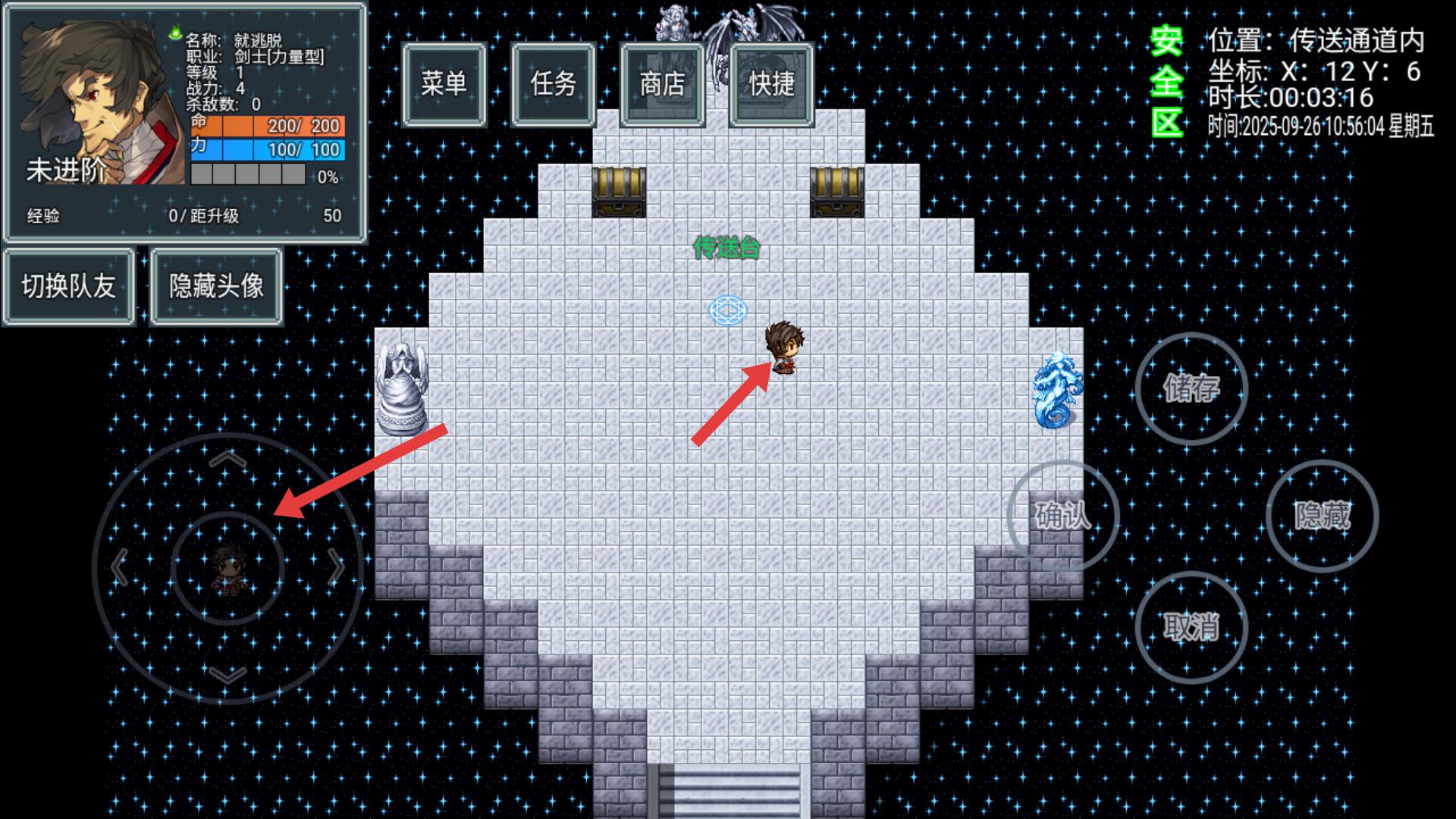 2、進(jìn)入游戲場(chǎng)景后,通過(guò)左側(cè)虛擬搖桿操控角色移動(dòng),前往傳送臺(tái)等關(guān)鍵區(qū)域,探索地圖,解鎖新內(nèi)容。