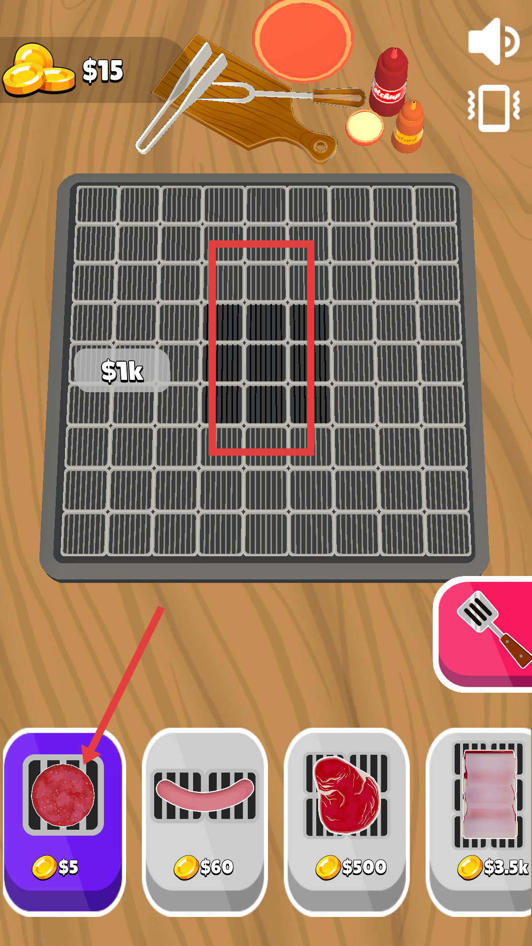 1、游戲初始有15美元,下方有不同價格食材,選5美元的食材放到烤架紅框區(qū)域,玩家就可以開始燒烤流程。