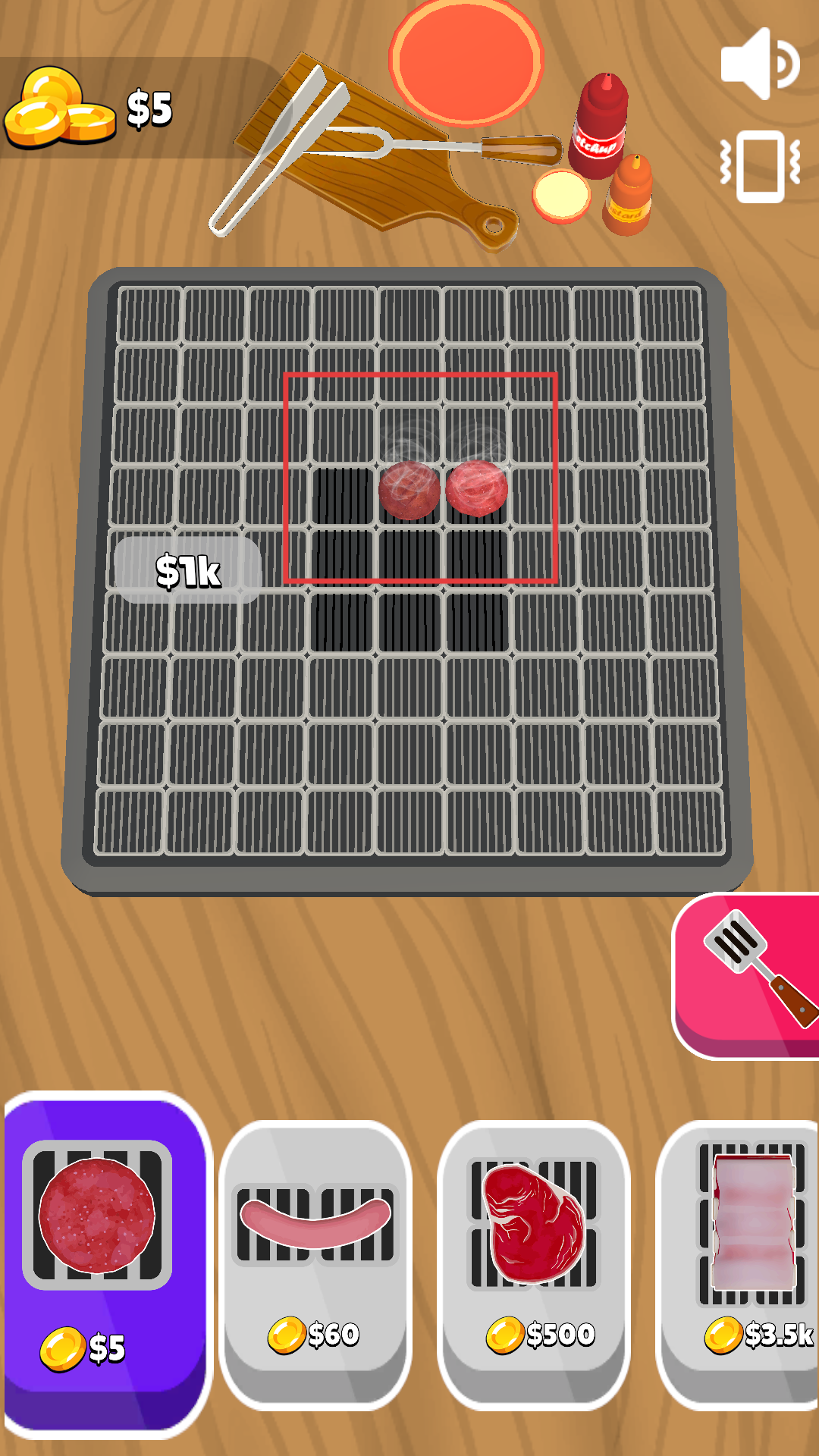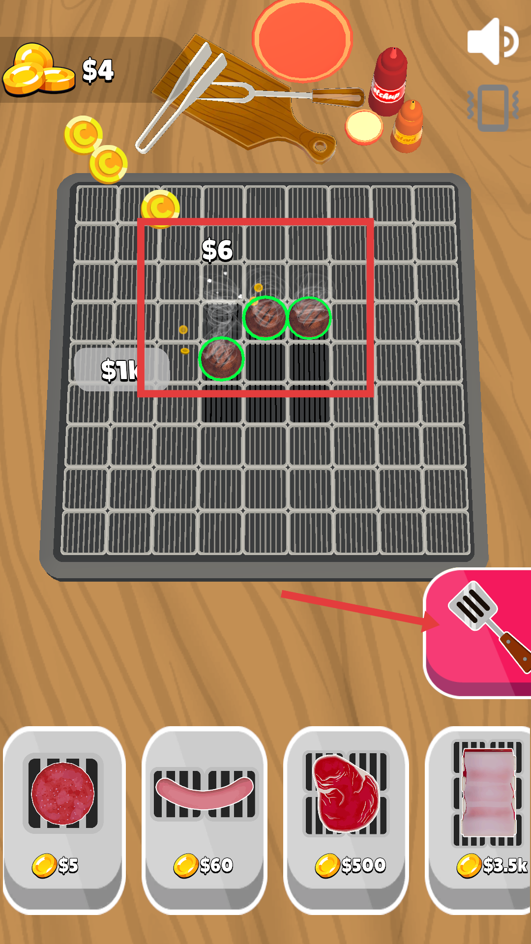 4、收取食材獲得金幣后,下方食材欄會解鎖新的60美元食材,可使用積累的金幣解鎖新食材繼續(xù)燒烤。