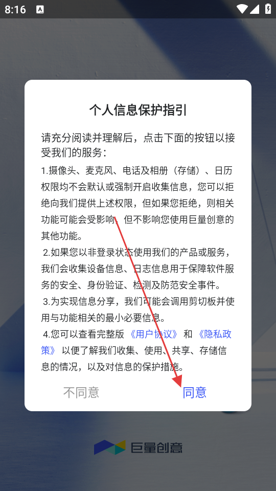 1、打開APP首先會彈出個人信息保護指引窗口,在這個窗口中詳細說明了平臺對個人信息的收集、使用、共享等情況,閱讀完畢后點擊同意按鈕,即可進入下一步操作。