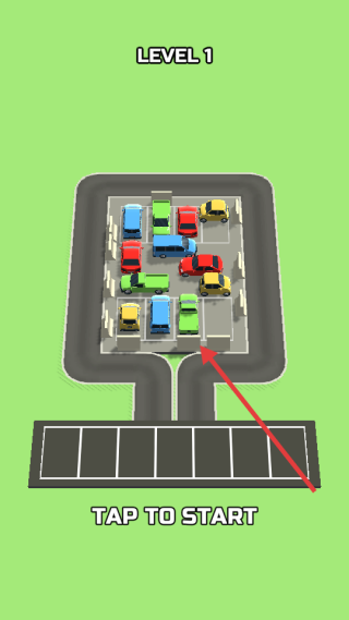 1、點(diǎn)擊TAP TO START開(kāi)始游戲,需規(guī)劃車輛移動(dòng)路線,讓車輛有序駛出停車場(chǎng),注意車輛間的位置關(guān)系避免擁堵。