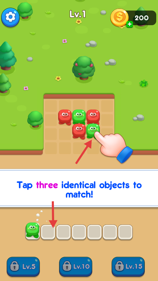 1、按照提示點(diǎn)擊三個(gè)相同的綠色方塊,將其放入下方空格,通過匹配相同方塊來推進(jìn)游戲,注意觀察方塊分布,快速找到可匹配的。