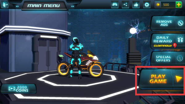 1、玩家下載游戲之后然后點擊進入在游戲主界面,點擊PLAY GAME按鈕,進入未來風格的摩托騎行關(guān)卡,開啟游戲挑戰(zhàn)。