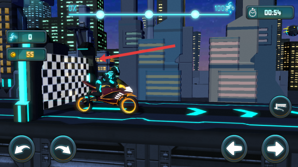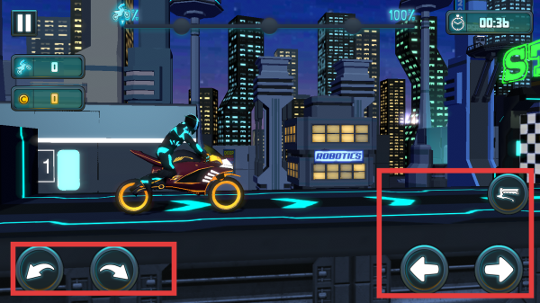 2、進入游戲后利用屏幕左下角的左右傾斜按鈕控制摩托車的平衡和傾斜角度,右下角的左右方向按鈕控制摩托車的前進方向。