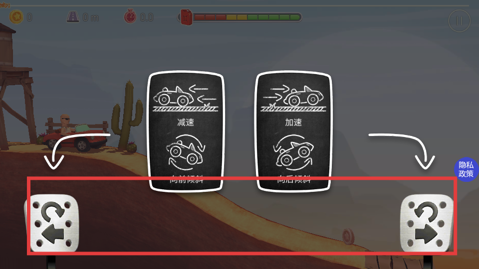 1、游戲開始先熟悉左右兩側(cè)的操作按鈕,左側(cè)可控制減速、向前傾斜,右側(cè)能控制加速、向后傾斜,利用這些按鈕操控車輛在山地行駛。