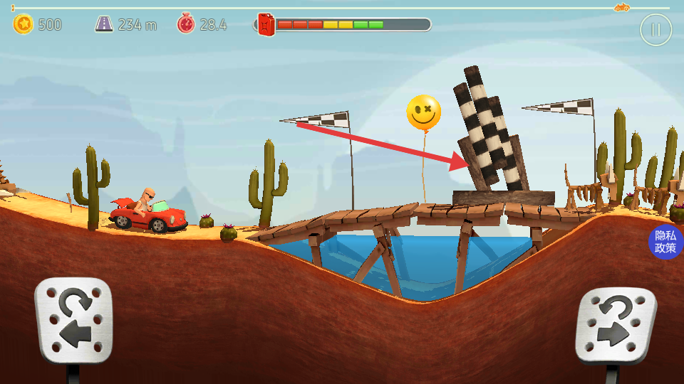 3、繼續(xù)駕駛車輛朝著帶有黑白格子旗的終點(diǎn)目標(biāo)前進(jìn),途中小心跨越木橋等路段,保持車輛平衡順利抵達(dá)終點(diǎn)區(qū)域。