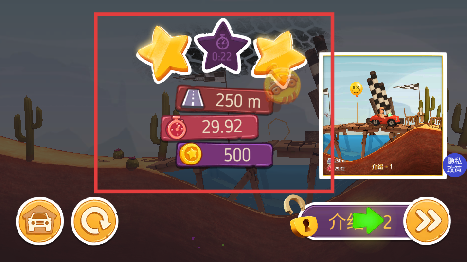 4、到達(dá)終點(diǎn)后會(huì)顯示行駛距離、時(shí)間和獲得的金幣等成績,若成績優(yōu)異還能獲得星級評價(jià),可選擇進(jìn)入下一關(guān)或重復(fù)挑戰(zhàn)提升表現(xiàn)。