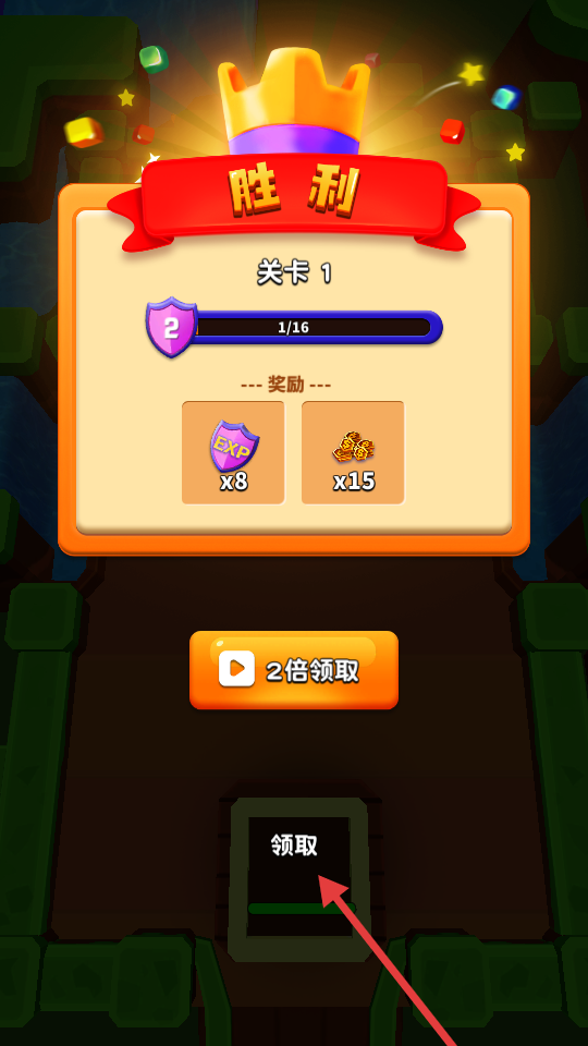 4、成功獲勝后會顯示關卡勝利界面,點擊領取按鈕可獲取經驗和金幣等獎勵,也可選擇2倍領取來獲得更多獎勵。