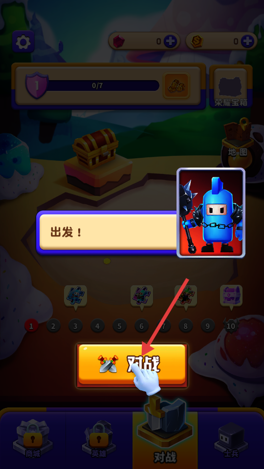 1、進入游戲點擊下方橙色對戰(zhàn)按鈕,即可進入對戰(zhàn)模式,開啟與其他玩家或敵方隊伍的戰(zhàn)斗,體驗游戲核心對戰(zhàn)玩法。