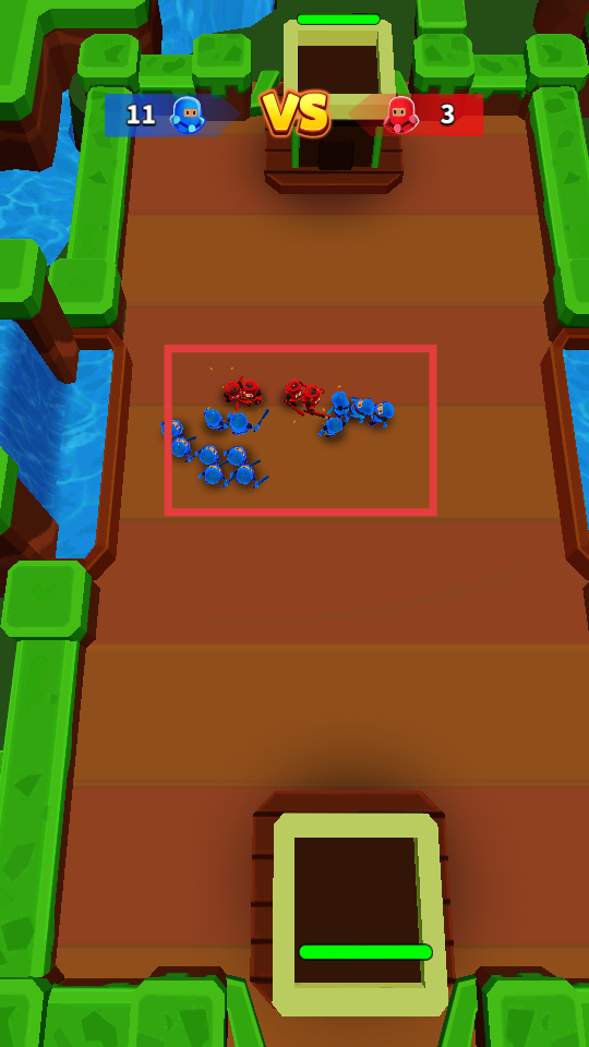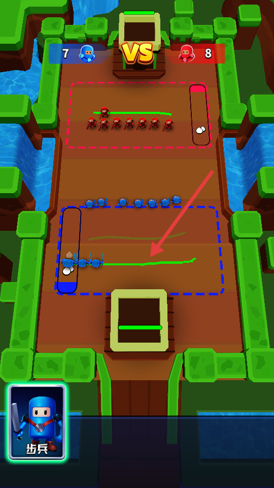 2、對戰(zhàn)時在己方區(qū)域部署士兵,通過拖動等操作派遣士兵,讓士兵沿著路徑向敵方區(qū)域推進,與敵方士兵形成對峙展開交鋒。