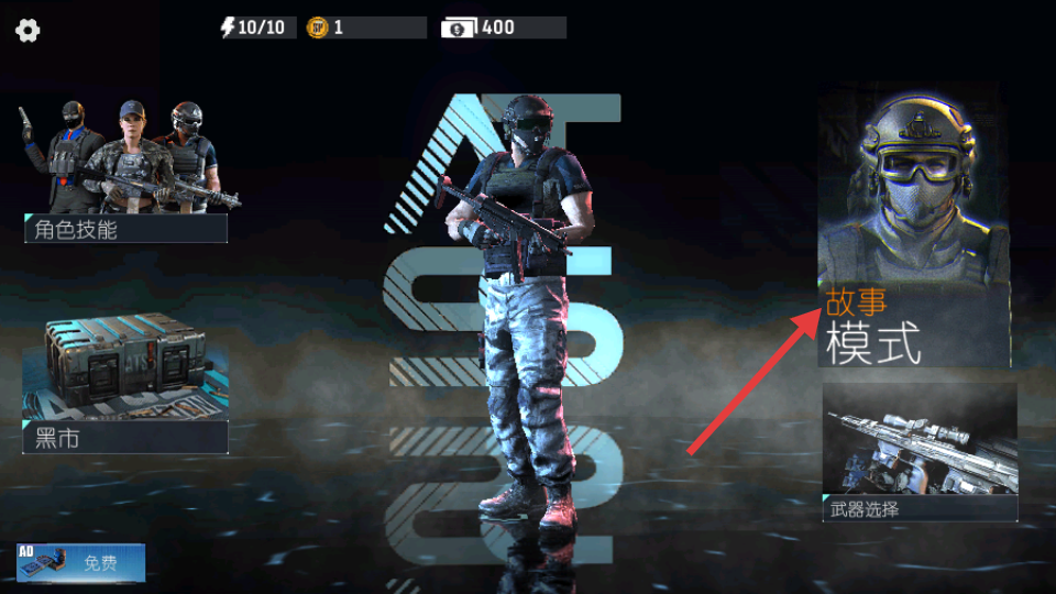 1、進入游戲后先點擊右側(cè)故事模式選項,這里能開啟帶有劇情的游戲流程,開啟獨特的射擊冒險。