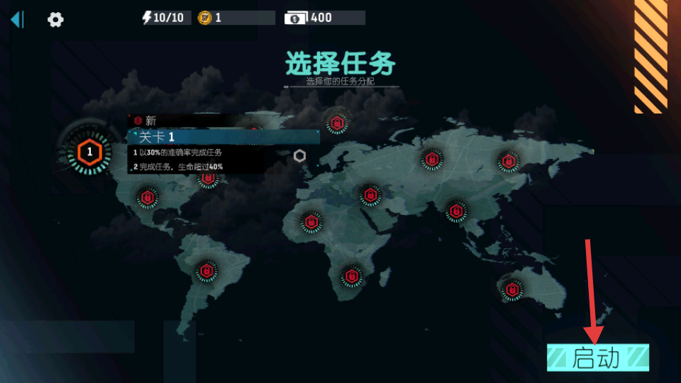 3、在章節(jié)選擇后來到任務(wù)選擇界面,選關(guān)卡1要滿足以百分之30準確率完成任務(wù)、生命超過百分之40的條件,點擊啟動進入關(guān)卡。