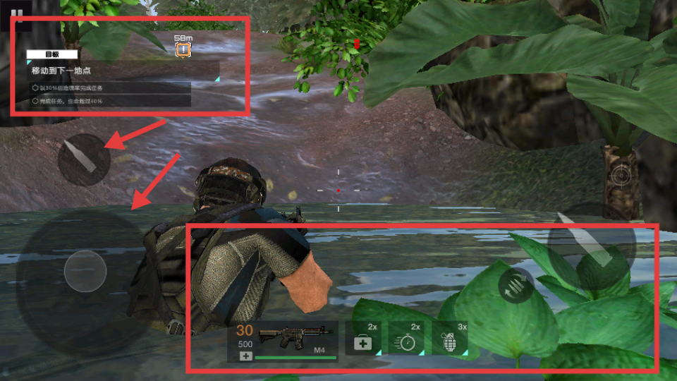 4、進入關(guān)卡后按左側(cè)移動按鈕操控角色移動,目標是抵達下一地點,同時注意利用武器射擊敵人,還可使用醫(yī)療包等道具維持生命。