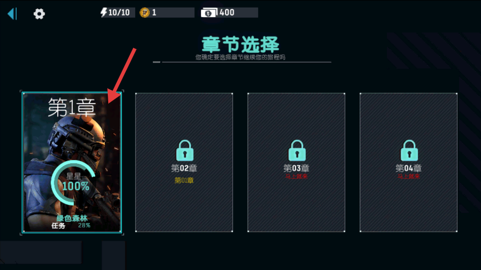 2、進入故事模式后,選擇第1章開始游戲,后續(xù)章節(jié)需完成前面章節(jié)任務(wù)才能解鎖,從第一章開啟你的征程。