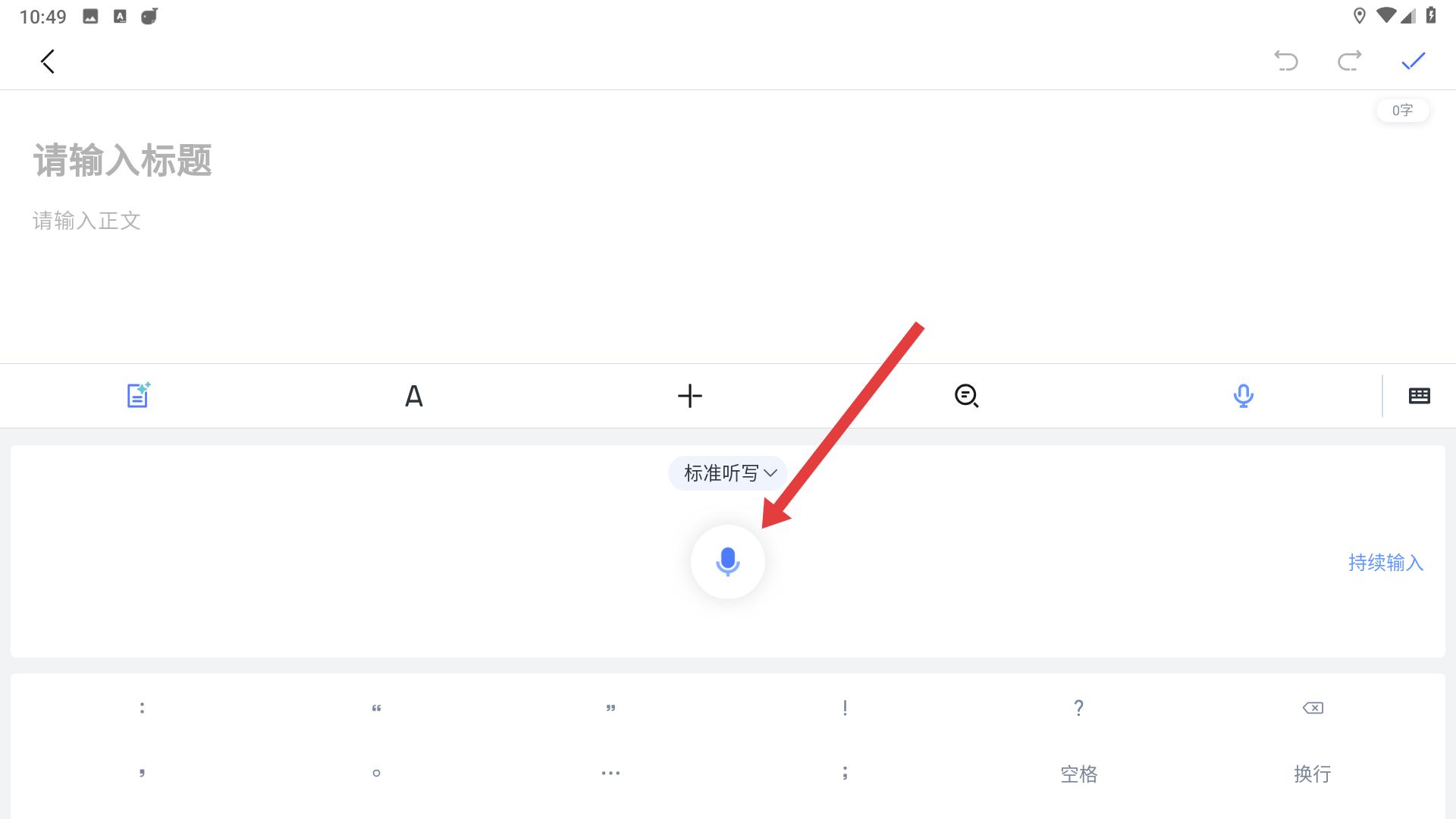 3、筆記編輯界面,點(diǎn)擊麥克風(fēng)圖標(biāo),可進(jìn)行語(yǔ)音聽(tīng)寫(xiě),將語(yǔ)音轉(zhuǎn)化為文字內(nèi)容。