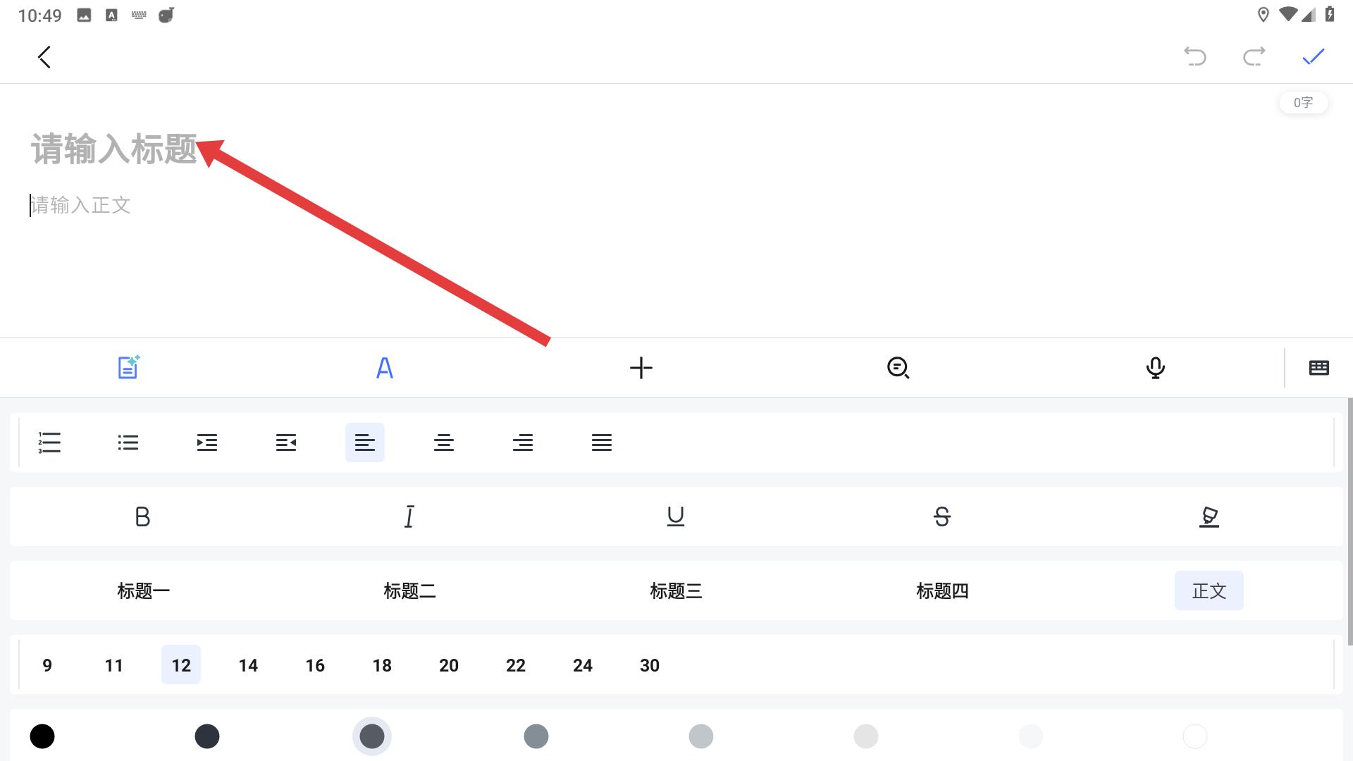 4、編輯區(qū)域輸入標(biāo)題,如今日工作記錄,方便對(duì)筆記進(jìn)行分類(lèi)和查找。