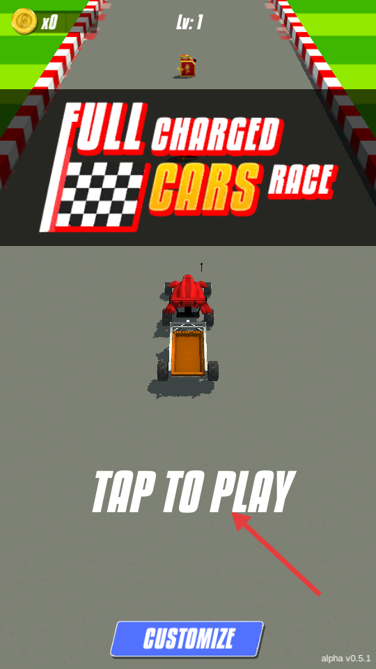1、游戲開始界面點(diǎn)擊TAP TO PLAY即可啟動(dòng)賽車,開啟充滿電的賽車競(jìng)速之旅,也可點(diǎn)擊CUSTOMIZE自定義賽車,讓賽車更具個(gè)性。