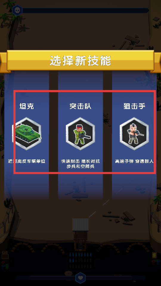 3、戰(zhàn)斗過程中會出現(xiàn)選擇新技能界面,可根據(jù)戰(zhàn)況選擇坦克、突擊隊或狙擊手技能,坦克適合反車輛,突擊隊擅長打步兵,狙擊手能穿透敵人。