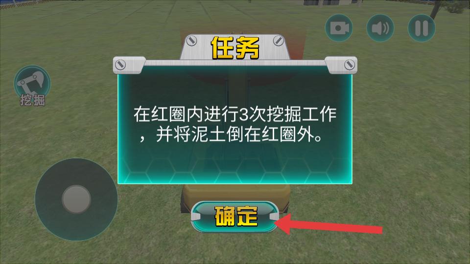 2、游戲界面會彈出任務(wù)提示,顯示要在紅圈內(nèi)進行3次挖掘并將泥土倒在紅圈外,點擊確定,開始執(zhí)行任務(wù)。