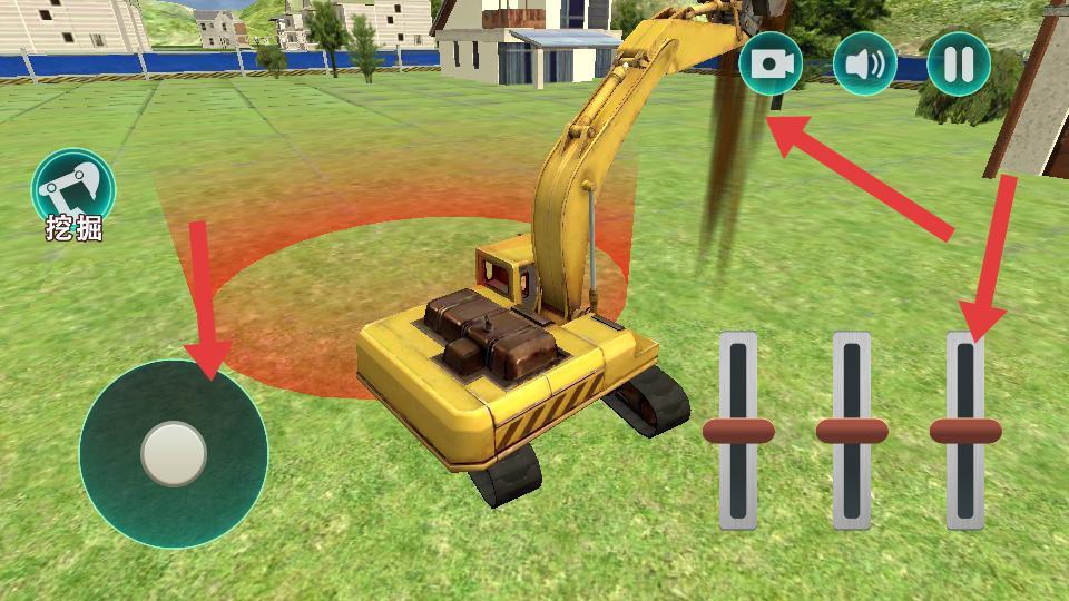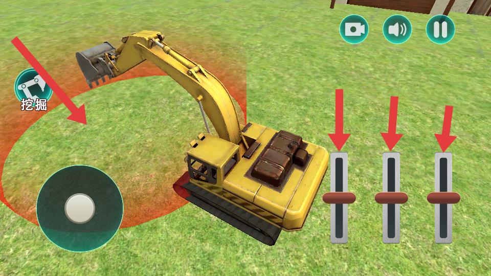 3、操控挖掘機,通過左側(cè)控制盤和右側(cè)滑塊,讓挖掘機移動到紅圈內(nèi),進行挖掘操作,獲取泥土。