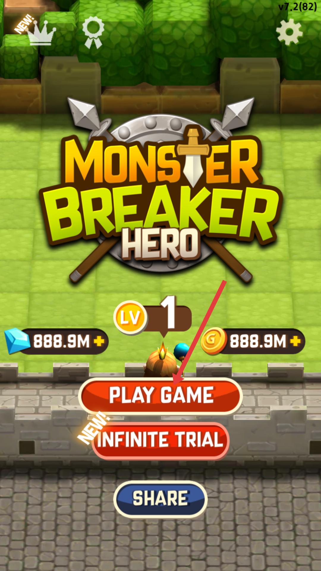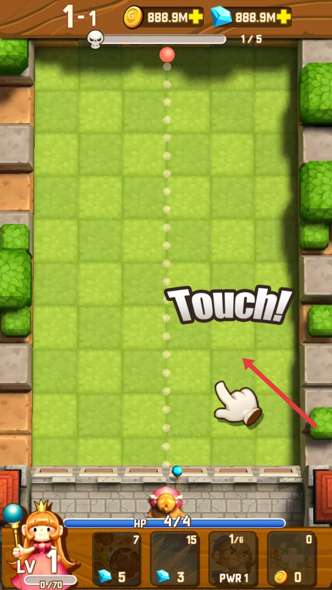 1、游戲主界面顯示游戲標題,等級為1,有大量鉆石和金幣,點擊開始游戲按鈕,即可進入游戲關(guān)卡,開始冒險。