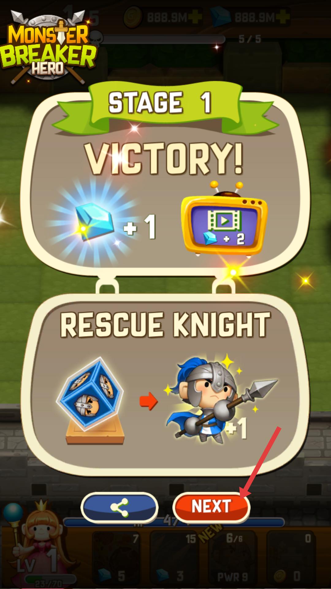 4、成功通過第一關(guān)后,界面顯示第一關(guān)勝利,獲得鉆石等獎勵,還能解救騎士,點擊NEXT按鈕,可進入下一關(guān)繼續(xù)游戲。