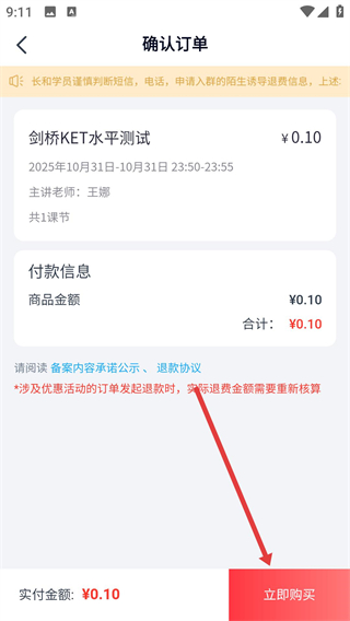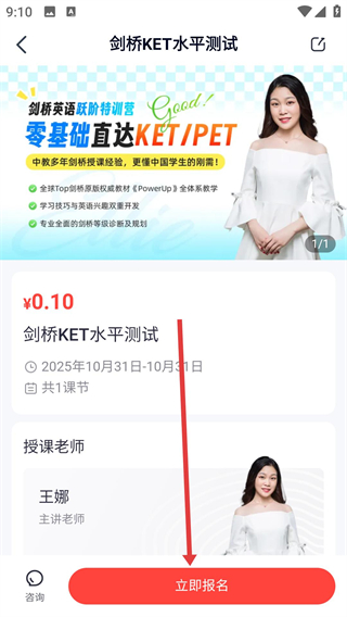 2、在劍橋KET水平測試詳情頁面,查看測試時間、授課老師等信息,確認無誤后,點擊立即報名,進入確認訂單頁面。
