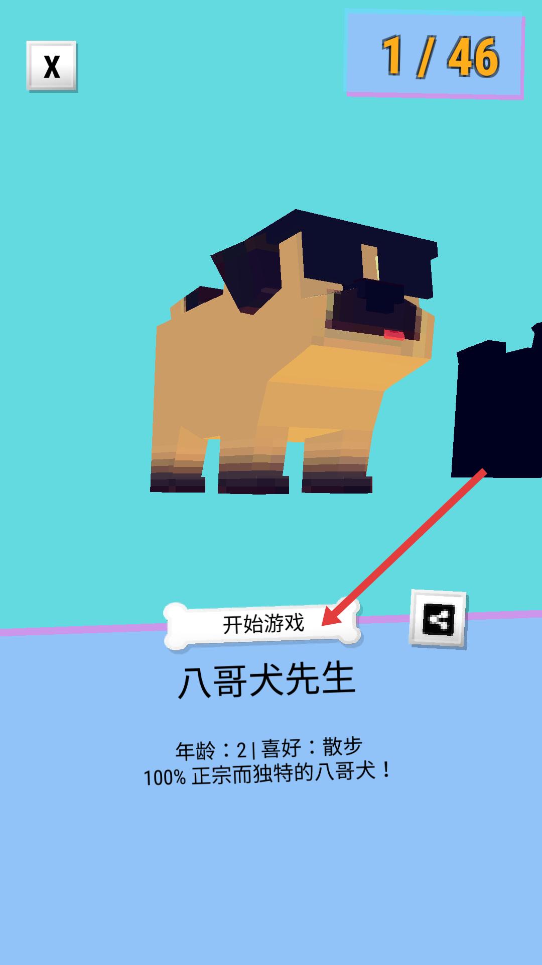 2、進(jìn)入角色選擇界面,展示八哥犬先生,介紹其年齡和喜好,點(diǎn)擊開始游戲按鈕,就能操控該巴哥犬,開始游戲關(guān)卡。