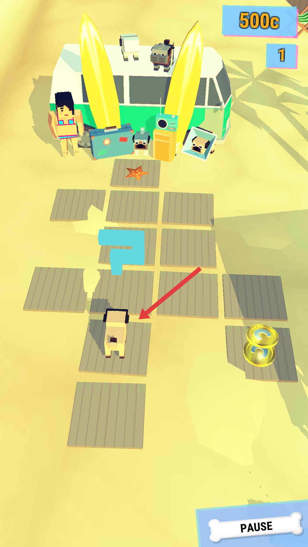 3、游戲場(chǎng)景為沙灘,操控巴哥犬在木板上移動(dòng),注意場(chǎng)景中的金幣等元素,通過移動(dòng)巴哥犬,探索場(chǎng)景,推進(jìn)游戲進(jìn)程。