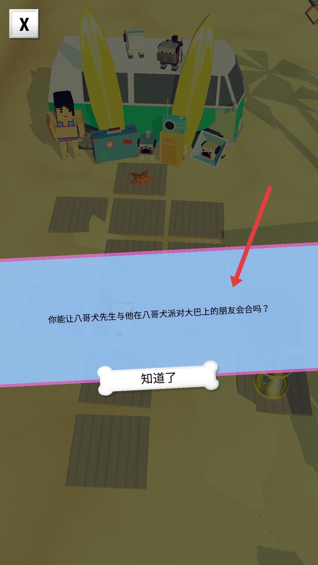 4、游戲彈出提示,詢問能否讓八哥犬先生與派對(duì)大巴上的朋友會(huì)合,點(diǎn)擊知道了,明確任務(wù)目標(biāo),繼續(xù)操控巴哥犬,完成會(huì)合任務(wù)。