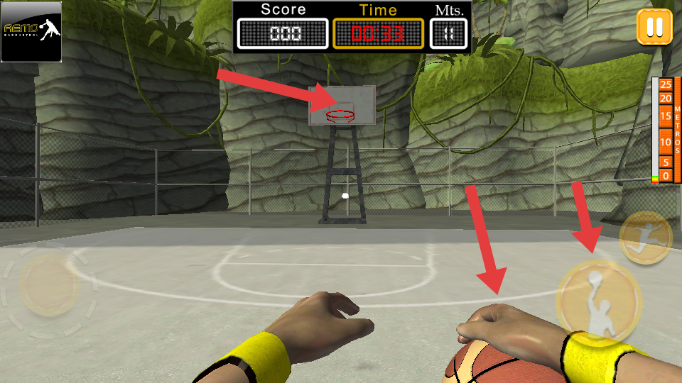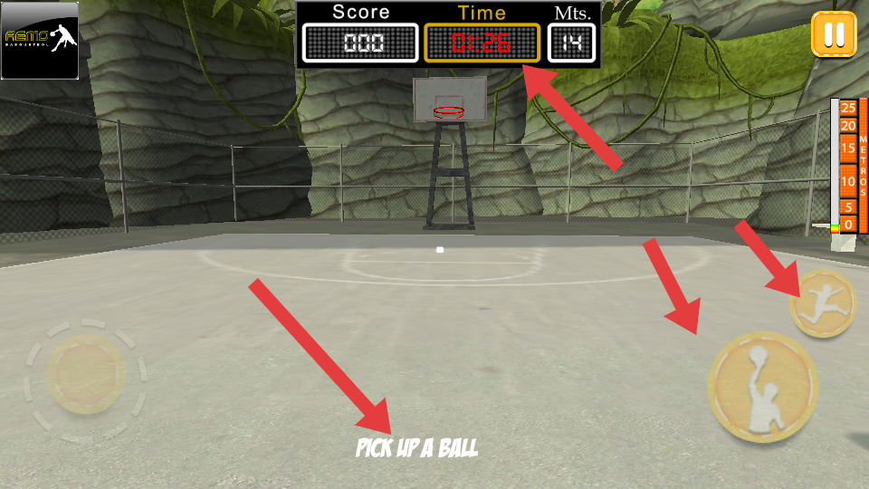 2、進(jìn)入游戲場(chǎng)景,能看到計(jì)分、計(jì)時(shí)等界面,按照提示撿起籃球,準(zhǔn)備進(jìn)行投籃操作。