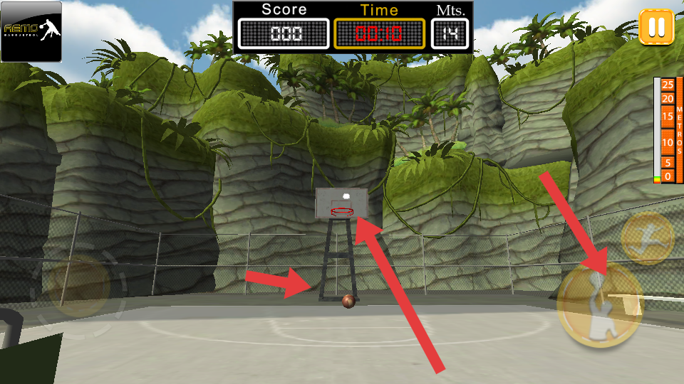 3、拿到籃球后,瞄準(zhǔn)籃筐,通過(guò)操作相關(guān)按鈕,將籃球投出,嘗試讓籃球精準(zhǔn)落入籃筐。