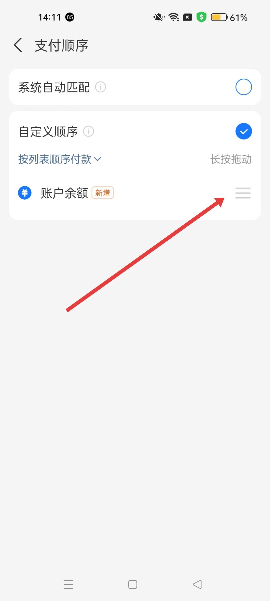 4、支付順序頁面可選擇系統(tǒng)自動匹配或自定義順序,若選擇自定義順序,可長按拖動支付方式調(diào)整順序。
