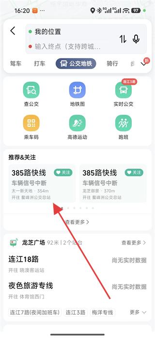 2、在公交地鐵查詢頁面,查看查公交、地鐵圖、實(shí)時(shí)公交等功能及推薦關(guān)注的385路快線等公交路線,點(diǎn)擊385路快線,進(jìn)入該公交路線詳情頁面。