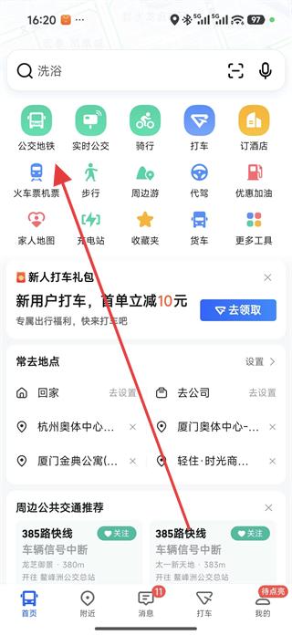 1、瀏覽公交地鐵、實(shí)時(shí)公交、騎行等功能選項(xiàng)及新人打車禮包、常去地點(diǎn)等內(nèi)容,點(diǎn)擊公交地鐵,進(jìn)入公交地鐵查詢頁面。