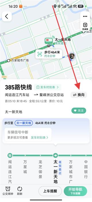 3、在公交路線詳情頁面,查看路線的起點(diǎn)、終點(diǎn)、票價(jià)等信息,點(diǎn)擊換向,可切換公交行駛方向,查看對(duì)應(yīng)的路線站點(diǎn)。