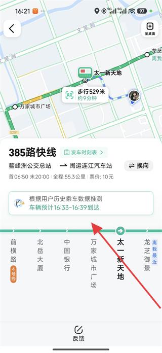 4、切換方向后可查看車輛預(yù)計(jì)到達(dá)時(shí)間等到站信息,根據(jù)這些信息合理安排出行時(shí)間,乘坐該公交路線。