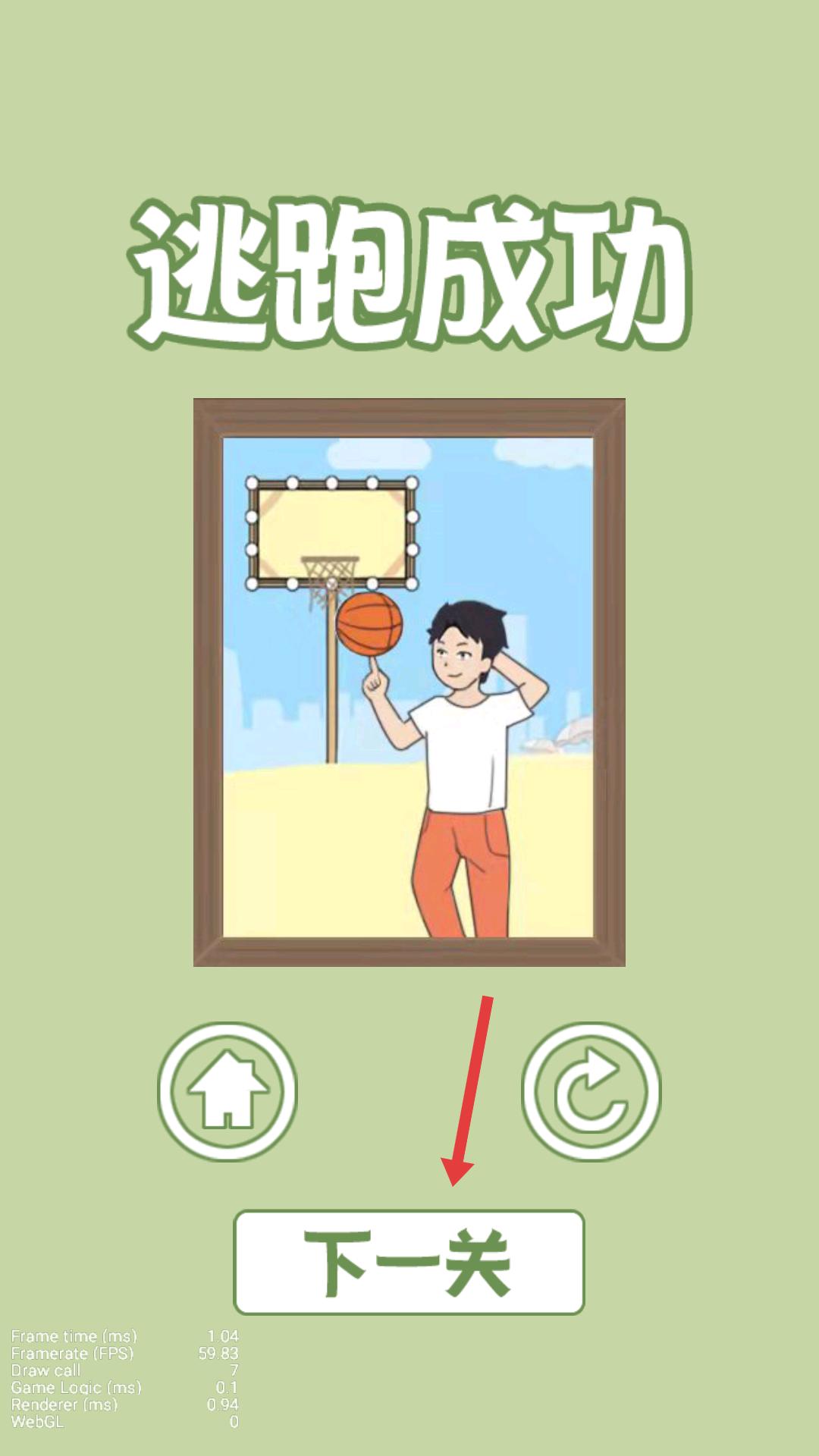 4、若成功讓孩子逃跑,界面顯示逃跑成功,下方有下一關(guān)按鈕,點擊下一關(guān)按鈕,進入下一關(guān),繼續(xù)挑戰(zhàn),尋找孩子并讓其成功逃跑。