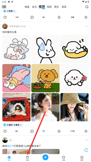 1、打開社交類APP,首頁可瀏覽推薦的各類內(nèi)容,點擊底部右友,進(jìn)入右友相關(guān)頁面。