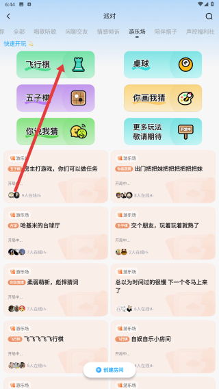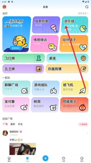 2、右友頁面,可看到派對大廳、唱歌聽歌、游樂場等多個功能入口,點擊游樂場,進(jìn)入游樂場相關(guān)頁面。