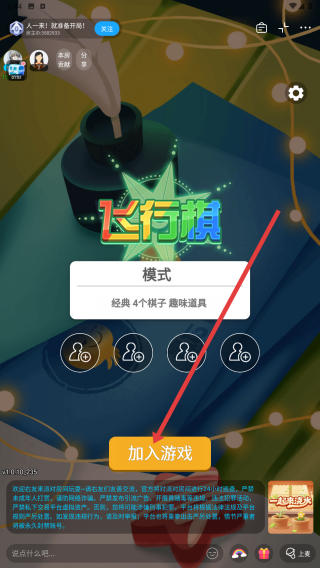 4、飛行棋游戲界面,選擇游戲模式后,點擊加入游戲,即可參與飛行棋游戲,和其他玩家一起游玩。