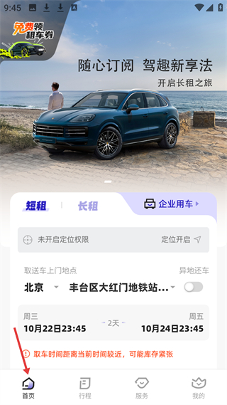 1、首頁可選短租、長租、企業(yè)用車,展示北京豐臺區(qū)取送車地點,有免費領(lǐng)租車券活動,滿足用戶多樣租車需求。