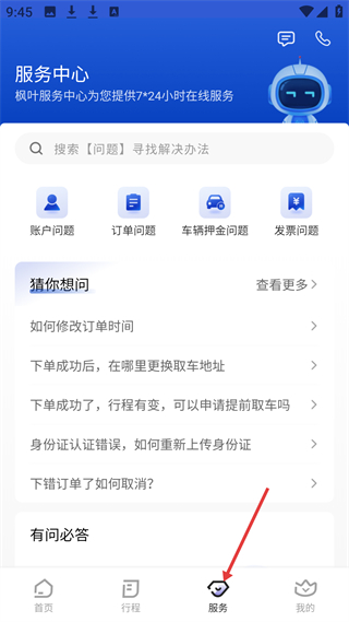 2、服務(wù)板塊是7、24小時在線服務(wù)中心,可查賬戶、訂單等問題,還有猜你想問的租車疑問解答,服務(wù)便捷高效。
