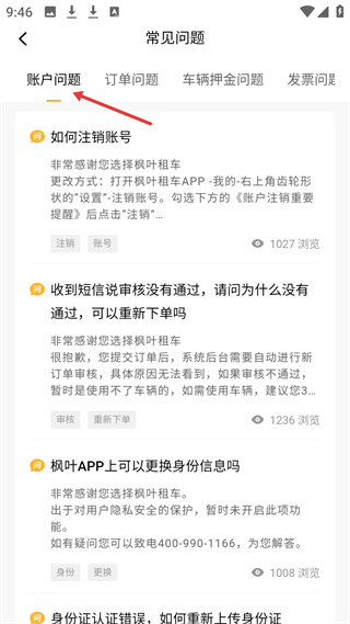 3、常見問題板塊分賬戶、訂單等類,解答注銷賬號、審核未通過等疑問,為用戶租車過程中的問題提供清晰解決方案。