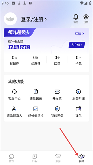 4、我的板塊可登錄注冊,管理楓葉卡余額,含客服中心、違章記錄等功能,助力用戶全面管理租車事務(wù),功能布局清晰實用。