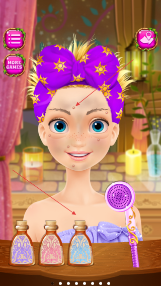2、進(jìn)入護(hù)理界面后,利用桌上的護(hù)理用品,為公主進(jìn)行臉部清潔和護(hù)理,處理臉上的小瑕疵,讓公主的肌膚更加光潔。