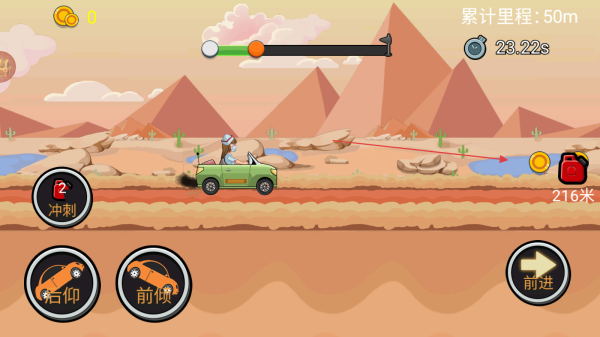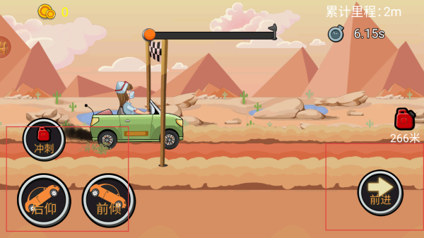 2、進(jìn)入游戲場景后點擊屏幕右下角的前進(jìn)按鈕,控制車輛向前行駛,在行駛過程中利用右仰和前傾按鈕調(diào)整車輛的姿態(tài)。