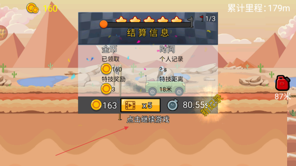 4、當(dāng)車輛行駛結(jié)束會出現(xiàn)結(jié)算信息界面,顯示獲得的金幣、特技獎勵等,點擊圖標(biāo)點擊繼續(xù)游戲區(qū)域繼續(xù)開始。