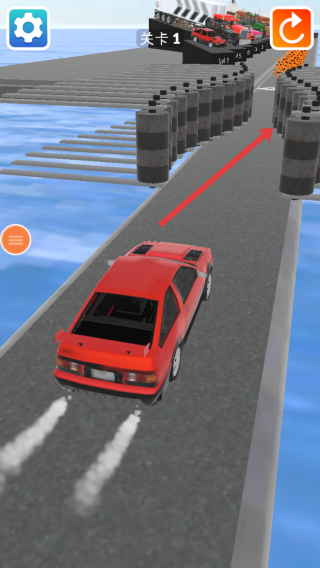 2、駕駛汽車(chē)水上道路行駛,道路有圓柱障礙,需操控汽車(chē)躲避障礙,朝著關(guān)卡目標(biāo)方向前進(jìn)。