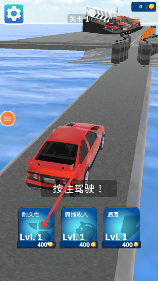 1、進(jìn)入游戲,操控紅色汽車(chē),界面有按住駕駛提示,可升級(jí)耐久性、離線(xiàn)收入、速度等屬性助力行駛。